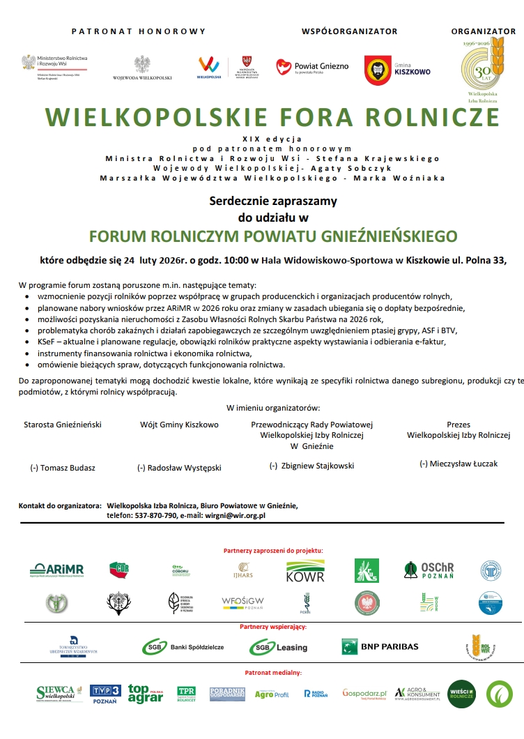 Zapraszamy do udziału w Forum Rolniczym Powiatu Gnieźnieńskiego